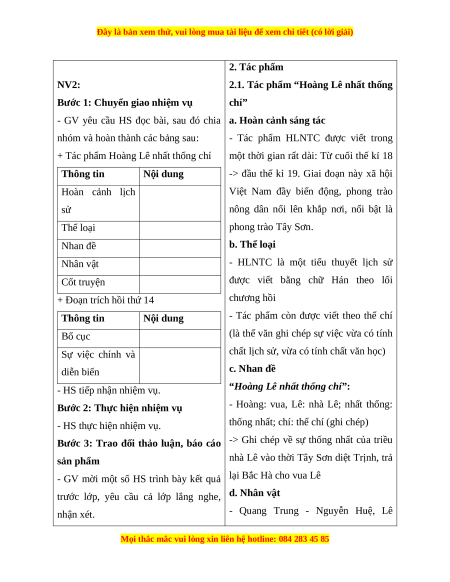 - HS biết được những nét chung về tác phẩm “Hoàng Lê Nhất thống chí”.
