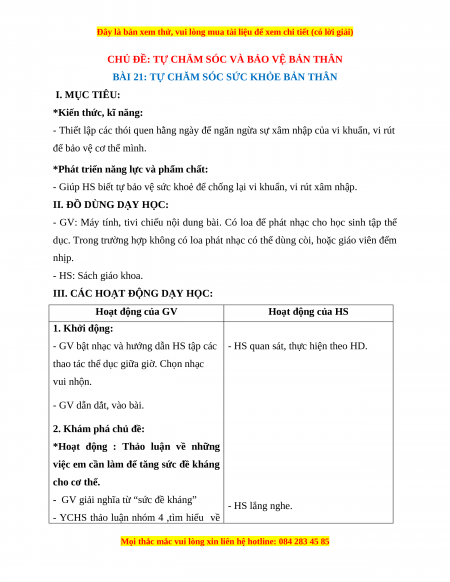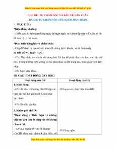 BÀI 21: TỰ CHĂM SÓC SỨC KHỎE BẢN THÂN I. MỤC TIÊU: