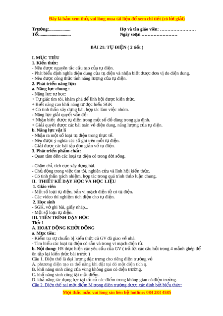 ố ồ dùng trong gia đình. + Giải quy t ế đư c ợ các bài toán v đi ề n dung, nă ệ ng lư ng c ợ a ủ t đi ụ n. ệ b. Năng l c ự v t l ậ í - Nhận ra m t ộ s l ố oại t đi ụ n t ệ rong th c ự t . ế - Nêu đư c ợ ý nghĩa các s ghi ố trên m i ỗ t đi ụ n. ệ - Giải đư c ợ các bài t p đ ậ n gi ơ ản v t ề đi ụ n. ệ 3. Phát tri n ể phẩm chất: - Quan tâm đ n c ế ác loại tụ đi n c ệ ó trong đ i ờ s ng. ố - Chăm ch , ỉ tích c c ự xây d ng bà ự i. - Ch đ ủ ng t ộ rong vi c ệ tìm tòi, nghiên c u ứ và lĩnh h i ộ ki n ế th c ứ . - Có tinh thần trách nhi m ệ , h p t
