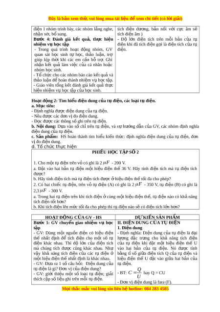 ứ cho các nhóm báo cáo k t ế qu ả và thảo luận đ hoà ể n thành nhi m ệ v h ụ c ọ tập. - Giáo viên t ng ổ k t ế đánh giá k t ế quả th c ự hi n nhi ệ ệm v h ụ c ọ tập c a ủ h c ọ sinh. Hoạt đ n ộ g 2: Tìm hi u ể đi n ệ dung c a ủ t đ ụ i n ệ , các lo i ạ t đ ụ i n ệ . a. M c ụ tiêu: - Đ nh nghĩ ị a đư c ợ đi n ệ dung c a ủ tụ đi n. ệ - Nêu đư c ợ các đ n v ơ ị đo đi n dung. ệ - Đ c ọ đư c ợ các thông s ghi ố trên t đi ụ n. ệ b. N i ộ dung: D a