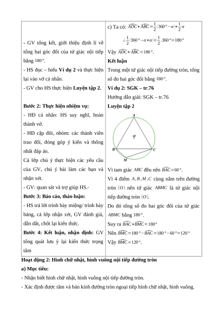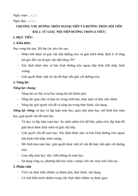 BÀI 2. TỨ GIÁC NỘI TIẾP ĐƯỜNG TRÒN (3 TIẾT) I. MỤC TIÊU: