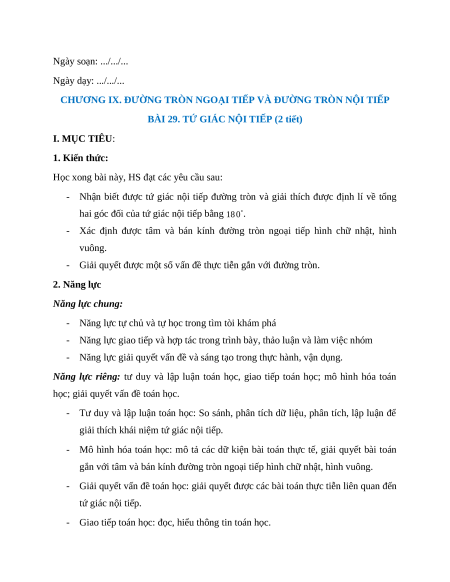 BÀI 29. TỨ GIÁC NỘI TIẾP (2 tiết) I. MỤC TIÊU: