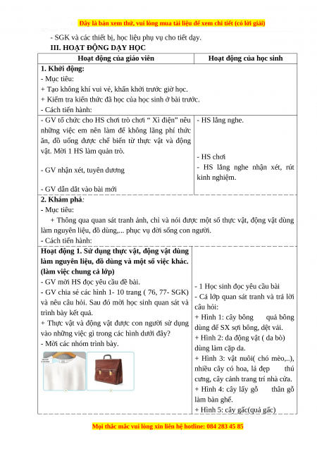 - Nêu được một số thực vật, động vật dùng làm nguyên liệu, đồ dùng,... phục vụ đời sống con người.