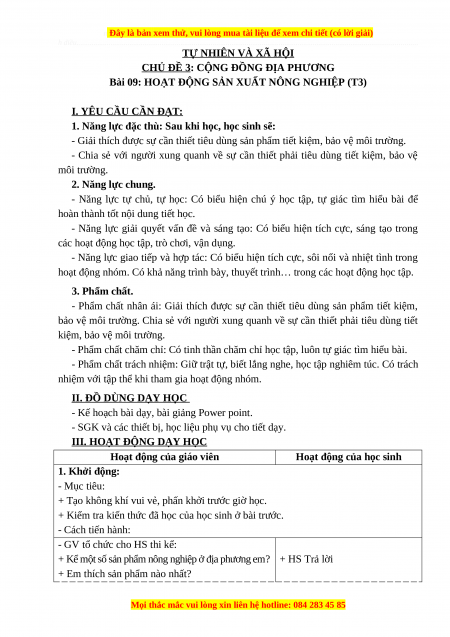 Bài 09: HOẠT ĐỘNG SẢN XUẤT NÔNG NGHIỆP (T3) I. YÊU CẦU CẦN ĐẠT: