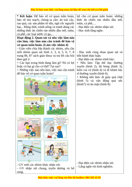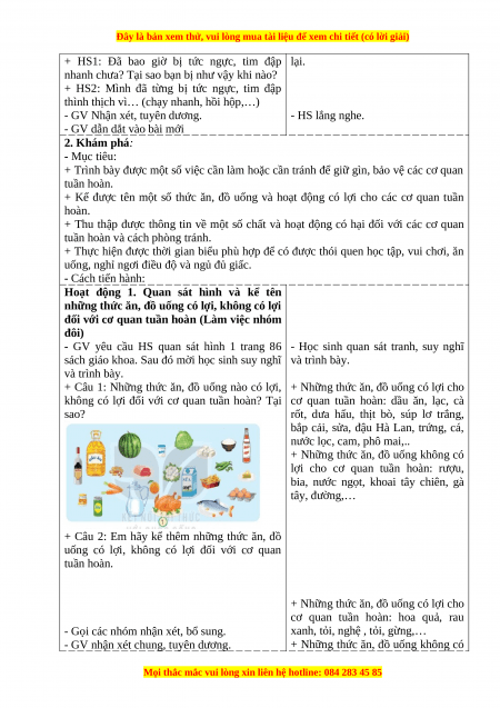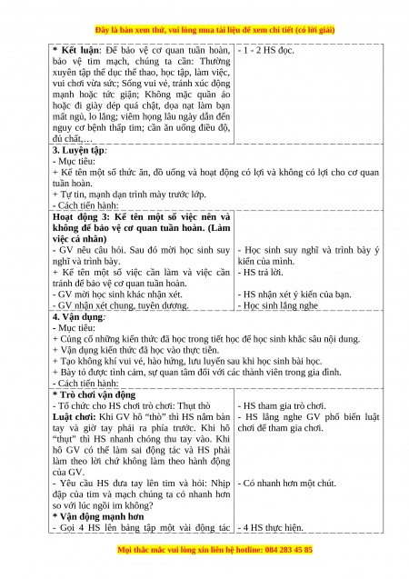 - Kể được tên một số thức ăn, đồ uống và hoạt động có lợi cho các cơ quan tuần hoàn.