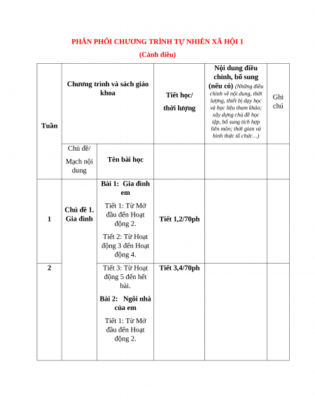 PHÂN PHỐI CHƯƠNG TRÌNH TỰ NHIÊN XÃ HỘI 1 (Cánh diều) Nội dung điều chỉnh, bổ sung