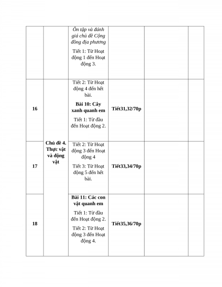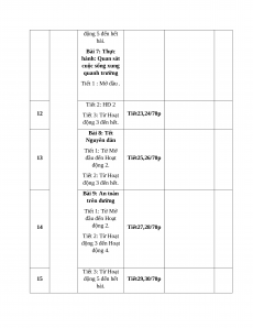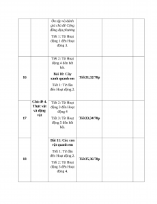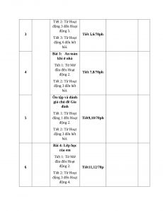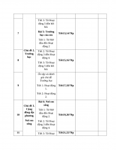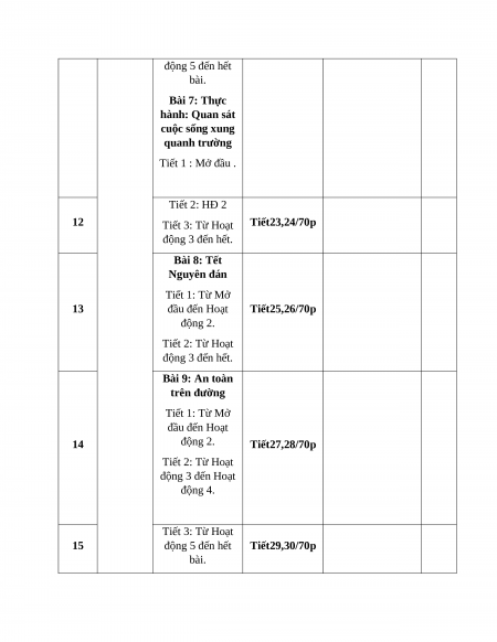 Tiết 1: Hoạt động Tiết17,18/70p 1. Tiết 2: Hoạt động 2. Bài 6: Nơi em Chủ đề 3. sống Cộng Tiết 1: Từ Mở đồng địa đầu đến Hoạt 10 phương Tiết19,20/70p động 2. Nơi em Tiết 2: Từ Hoạt sống động 3 đến Hoạt động 4. 11 Tiết 3: Từ Hoạt Tiết21,22/70p động 5 đến hết bài. Bài 7: Thực hành: Quan sát cuộc sống xung quanh trường Tiết 1 : Mở đầu . Tiết 2: HĐ 2 12 Tiết 3: Từ Hoạt Tiết23,24/70p động 3 đến hết. Bài 8: Tết Nguyên đán Tiết 1: Từ Mở 13 đầu đến Hoạt Tiết25,26/70p động 2. Tiết 2: Từ Hoạt động 3 đến hết. Bài 9: An toàn trên đường Tiết 1: Từ Mở đầu đến Hoạt 14 động 2. Tiết27,28/70p Tiết 2: Từ Hoạt động 3 đến Hoạt động 4. Tiết 3: Từ Hoạt 15 động 5 đến hết Tiết29,30/70p bài.