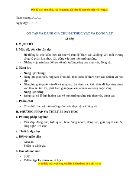 ÔN TẬP VÀ ĐÁNH GIÁ CHỦ ĐỀ THỰC VẬT VÀ ĐỘNG VẬT (2 tiết) I. MỤC TIÊU