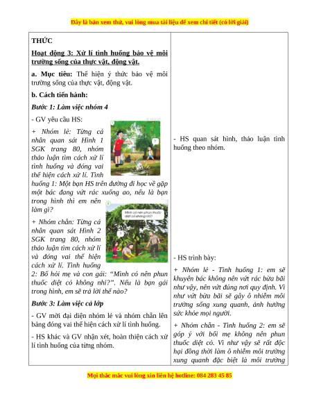 Đóng vai xử lí tình huống bảo vệ môi trường sống của thực vật, động vật. 3. Phẩm chất