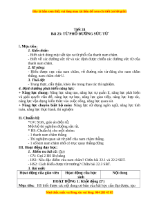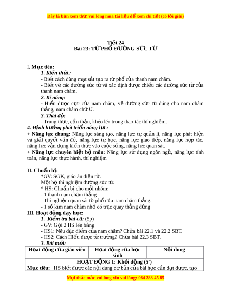 Đây là bản xem th , vu ử i lòng mua tài li u ệ đ xe ể m chi ti t (c ế ó l i ờ gi i ả ) Ti t ế 24 Bài 23: TỪ PH Đ Ổ Ư N Ờ G S C Ứ TỪ I. Mục tiêu: 1. Ki n ế th c: ứ - Bi t ế cách dùng m t ạ s t ắ t o r ạ a t ph ừ c ổ a t ủ hanh nam châm. - Bi t ế vẽ các đư ng ờ s c ứ t ừ và xác đ nh ị đư c ợ chi u ề các đư ng ờ s c ứ t ừ c a ủ thanh nam châm. 2. Kĩ năng: - Hi u ể đư c ợ c c ự c a ủ nam châm, vẽ đư ng ờ s c ứ từ đúng cho nam châm th ng, ẳ nam châm ch U ữ . 3. Thái đ : ộ - Trung th c, ự c n t ẩ h n, khéo l ậ
