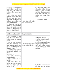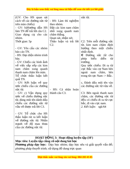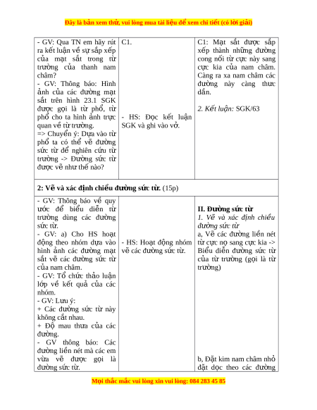 Đây là bản xem th , vu ử i lòng mua tài li u ệ đ xe ể m chi ti t (c ế ó l i ờ gi i ả ) - GV: Qua TN em hãy rút C1. C1: M t ạ s t ắ đư c ợ s p ắ ra k t ế lu n ậ v ề s ự s p ắ x p ế x p ế thành nh ng ữ đư ng ờ c a ủ m t ạ s t ắ trong từ cong nối từ c c ự này sang trư ng ờ c a ủ thanh nam c c ự kia c a ủ nam châm. châm? Càng ra xa nam châm các - GV: Thông báo: Hình đư ng ờ này càng th c ư nh ả c a ủ các đư ng ờ m t ạ dần. s t ắ trên hình 23.1 SGK đư c ợ g i ọ là từ ph , ổ từ 2. K t ế lu n: ậ SGK/63 phổ cho ta hình nh ả tr c ự - HS: Đ c ọ k t ế lu n ậ quan về t t ừ rư ng. ờ SGK và ghi vào v . ở => Chuy n ể ý: D a ự vào từ
