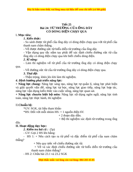 Đây là bản xem th , vu ử i lòng mua tài li u ệ đ xe ể m chi ti t (c ế ó l i ờ gi i ả ) Ti t ế 25 Bài 24: TỪ TRƯ N Ờ G C A Ủ N Ố G DÂY CÓ DÒNG ĐI N Ệ CH Y Ạ QUA I. Mục tiêu: 1. Ki n ế th c: ứ - So sánh đư c ợ t ừ ph ổ c a ủ ng ố dây có dòng đi n ệ ch y ạ qua v i ớ t ừ ph ổ c a ủ thanh nam châm th ng. ẳ - Vẽ đư c ợ đư ng s ờ ức t bi ừ u di ể n t ễ t ừ rư ng c ờ a ủ ng dây ố - V n ậ d ng ụ quy t c ắ n m ắ tay ph i ả để xác đ nh ị chi u ề đư ng ờ s c ứ từ c a ủ