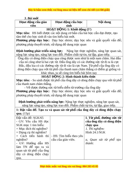 Mục tiêu: - So sánh đư c ợ từ ph c ổ a ủ ng dây ố có dòng đi n ch ệ y ạ qua v i ớ t ừ phổ c a ủ thanh nam châm th ng. ẳ - Vẽ đư c ợ đư ng s ờ ức t bi ừ u di ể n t ễ t ừ rư ng c ờ a ủ ng dây ố Phư ng ơ pháp d y ạ h c: ọ D y ạ h c ọ nhóm; d y ạ h c ọ nêu và gi i ả quy t ế v n ấ đề; phư ng ơ pháp thuy t ế trình; s d ử ng đ ụ ồ dung tr c ự quan Đ nh h ị ư ng ớ phát tri n năng l ể c ự : Năng l c t ự h c nghi ự m ệ , năng l c quan s ự át, năng l c s ự áng t o, năng l ạ c ự trao đ i ổ . Ph m ẩ ch t ấ t t ự in, t l ự p, ậ giao ti p. ế 1: Đ t ặ v n ấ đ . ề T o