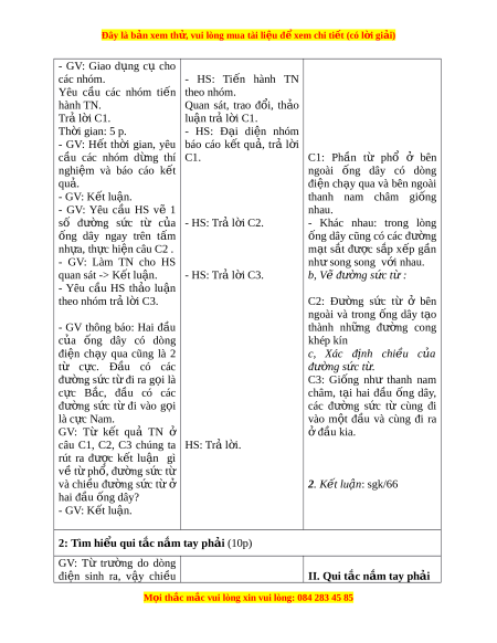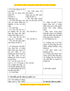 Đây là bản xem th , vu ử i lòng mua tài li u ệ đ xe ể m chi ti t (c ế ó l i ờ gi i ả ) - GV: Giao d ng ụ cụ cho các nhóm. - HS: Ti n ế hành TN Yêu c u ầ các nhóm ti n ế theo nhóm. hành TN. Quan sát, trao đ i ổ , th o ả Tr l ả i ờ C1. lu n ậ trả l i ờ C1. Th i ờ gian: 5 p. - HS: Đ i ạ di n ệ nhóm - GV: H t ế th i ờ gian, yêu báo cáo k t ế qu , ả trả l i ờ cầu các nhóm d ng ừ thí C1. C1: Ph n ầ từ phổ ở bên nghiệm và báo cáo k t ế ngoài ống dây có dòng qu . ả điện ch y ạ qua và bên ngoài - GV: K t ế lu n. ậ thanh nam châm gi ng ố - GV: Yêu c u ầ HS vẽ 1 nhau. số đư ng ờ s c ứ từ c a ủ - HS: Tr l ả i ờ C2. - Khác nhau: trong lòng ống dây ngay trên t m ấ ng ố dây cũng có các đư ng ờ nh a, ự th c hi ự n câu C ệ 2 . m t ạ s t ắ đư c ợ s p ắ x p ế g n ầ - GV: Làm TN cho HS nh s ư ong song v i ớ nhau. quan sát -> K t ế lu n. ậ - HS: Tr l ả i ờ C3. b, Vẽ đư ng ờ s c t ứ : ừ - Yêu c u ầ HS th o ả lu n ậ theo nhóm tr l ả i ờ C3. C2: Đư ng ờ s c ứ từ ở bên ngoài và trong ng ố dây t o ạ - GV thông báo: Hai đ u ầ thành nh ng ữ đư ng ờ cong c a ủ ống dây có dòng khép kín điện ch y ạ qua cũng là 2 c, Xác đ nh ị chi u ề c a ủ từ c c. ự Đ u ầ có các đư ng s ờ ức t . ừ đư ng ờ sức t đi ừ ra g i ọ là C3: Gi ng ố như thanh nam c c ự B c, ắ đ u ầ có các châm, t i ạ hai đ u ầ ng ố dây, đư ng ờ s c ứ từ đi vào g i ọ các đư ng ờ s c ứ từ cùng đi là c c ự Nam. vào m t ộ đ u ầ và cùng đi ra GV: Từ k t ế quả TN ở đ ở ầu kia.