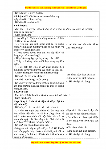Hoạt động 2. Chia sẻ kỉ niệm về thầy cô(Làm việc nhóm 2)
