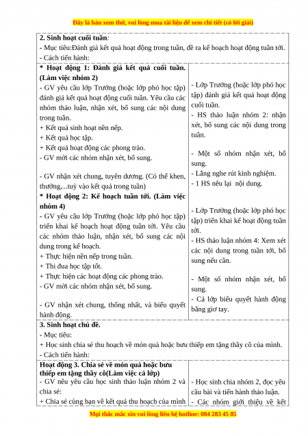 - Mục tiêu:Đánh giá kết quả hoạt động trong tuần, đề ra kế hoạch hoạt động tuần tới.