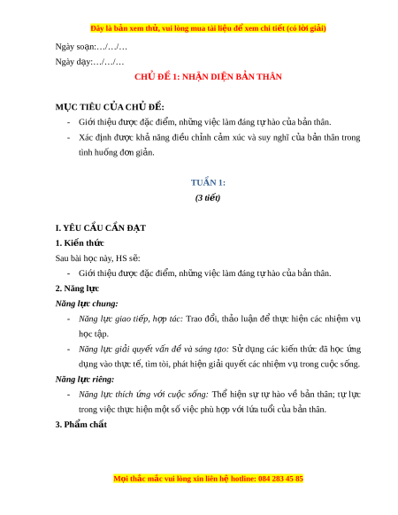 ệ đ xe ể m chi ti t (c ế ó lời gi i ả ) Ngày so n ạ :…/…/… Ngày d y ạ :…/…/… CHỦ Đ Ề 1: NH N Ậ DI N Ệ B N Ả THÂN MỤC TIÊU C A Ủ CH Ủ Đ : Ề - Gi i ớ thi u ệ đ c ượ đ c ặ đi m, ể nh n ữ g vi c ệ làm đáng t ự hào c a ủ b n ả thân. - Xác đ n ị h đ c ượ khả năng đi u ề ch n ỉ h c m ả xúc và suy nghĩ c a ủ b n ả thân trong tình hu n ố g đ n ơ gi n ả . TUẦN 1: (3 ti t ế ) I. YÊU C U Ầ C N Ầ Đ T Ạ 1. Ki n ế th c ứ Sau bài h c ọ này, HS s : ẽ - Gi i ớ thi u ệ đ c ượ đ c ặ đi m, ể nh n ữ g vi c ệ làm đáng t ự hào c a ủ b n ả thân. 2. Năng l c ự Năng l c ự chung: - Năng l c ự giao ti p ế , h p ợ tác: Trao đ i ổ , th o ả lu n ậ để th c ự hi n ệ các nhi m ệ vụ h c ọ t p ậ . - Năng l c ự gi i ả quy t ế v n ấ đề và sáng t o ạ : Sử d n ụ g các ki n ế th c ứ đã h c ọ n ứ g d n ụ g vào th c ự t , ế tìm tòi, phát hi n ệ gi i ả quy t ế các nhi m ệ v ụ trong cu c ộ s n ố g. Năng l c ự riêng: - Năng l c ự thích n ứ g v i ớ cu c ộ s n ố g: Thể hi n ệ sự tự hào về b n ả thân; tự l c ự trong vi c ệ th c ự hi n ệ m t ộ s ố vi c ệ phù h p ợ v i ớ l a ứ tu i ổ c a ủ b n ả thân. 3. Phẩm ch t ấ M i