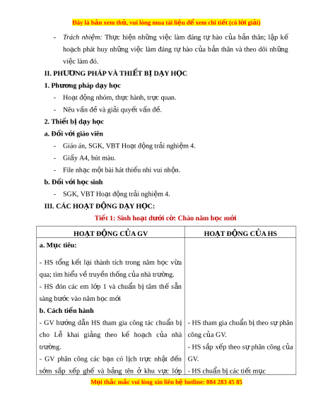 II. PHƯƠNG PHÁP VÀ THI T Ế B Ị D Y Ạ H C Ọ 1. Phư ng ơ pháp d y ạ h c ọ - Ho t ạ đ n ộ g nhóm, th c ự hành, tr c ự quan. - Nêu v n ấ đ ề và gi i ả quy t ế v n ấ đ . ề 2. Thi t ế b ị d y ạ h c ọ a. Đ i ố v i ớ giáo viên - Giáo án, SGK, VBT Ho t ạ đ n ộ g tr i ả nghi m ệ 4. - Gi y ấ A4, bút màu. - File nh c ạ m t ộ bài hát thi u ế nhi vui nh n ộ . b. Đ i ố v i ớ h c ọ sinh - SGK, VBT Ho t ạ đ n ộ g tr i ả nghi m ệ 4. III. CÁC HO T Ạ Đ N Ộ G DẠY H C Ọ : Tiết 1: Sinh ho t ạ dư i ớ c : ờ Chào năm h c ọ m i ớ HO T Ạ ĐỘNG C A Ủ GV HO T Ạ ĐỘNG C A Ủ HS a. M c ụ tiêu: - HS t n ổ g k t ế l i