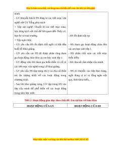 ượ phân công tham - HS chăm chủ xem các ti t ế m c ụ gia ho t ạ đ n ộ g chào đón các em h c ọ sinh l p ớ 1. bi u ể di n ễ . - GV đ n ộ g viên HS tham gia bi u ể di n ễ và c ổ vũ - HS chia s ẻ c m ả nh n ậ c a ủ mình. các ti t ế m c ụ văn ngh ệ trong L ễ khai gi n ả g. - GV yêu c u ầ HS t p ậ trung chú ý và chia s ẻ đi u ề - HS di chuy n ể vào l p ớ theo hàng, em n ấ t n ượ g nh t ấ về các ho t ạ đ n ộ g trong ng i ồ đúng vị trí và l n ắ g nghe n i ộ ch n ươ g trình. quy, th i ờ khóa bi u ể ,… - Sau khi khai gi n ả g xong, GV t p ậ trung HS vào l p ớ c a ủ mình để phổ bi n ế về các ho t ạ đ n ộ g trong năm h c ọ m i ớ . Tiết 2: Ho t ạ đ ng ộ giáo d c ụ theo ch ủ đ : ề Em t ự hào v ề b n ả thân HO T Ạ ĐỘNG C A Ủ GV HO T Ạ ĐỘNG C A Ủ HS M i