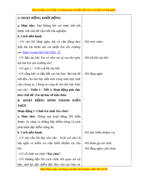 ệ đ xe ể m chi ti t (c ế ó lời gi i ả ) A. HOẠT ĐỘNG KH I Ở Đ N Ộ G a. M c ụ tiêu: T o ạ không khí vui t i ươ , k t ế n i ố đ c ượ v i ớ ch ủ đ ề c a ủ ti t ế tr i ả nghi m. ệ b. Cách ti n ế hành - GV cho HS l n ắ g nghe, hát và v n ậ đ n ộ g theo - HS xem video. m t ộ bài hát thi u ế nhi vui nh n ộ Em yêu tr n ườ g