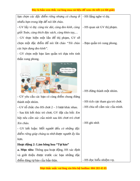 ụ tiêu: Thông qua ho t ạ đ n ộ g, HS hi u ể đ c ượ : Ai cũng có nh n ữ g đ c ặ đi m ể riêng và cách phát hi n ệ đ c ặ đi m ể riêng đó. b. Cách ti n ế hành: - HS đ c ọ hi u ể nhi m ệ v . ụ - GV yêu c u ầ HS đ c ọ yêu c u ầ – SGK tr.6 cho cả l p ớ nghe và ki m ể tra vi c ệ hi u ể nhi m ệ vụ c a ủ - HS tham gia trò ch i ơ . HS. - HS l n ắ g nghe cách ch i ơ . - GV t ổ ch c ứ trò ch i