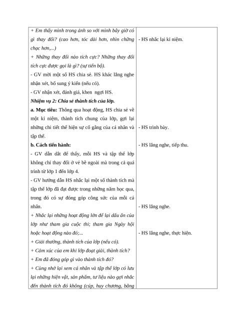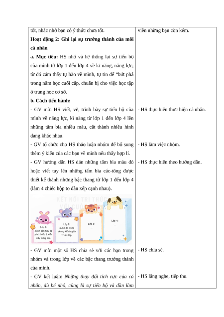 - Nhận diện được sự thay đổi của bản thân thông qua các tư liệu, các sản phẩm được lưu giữ.