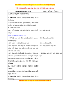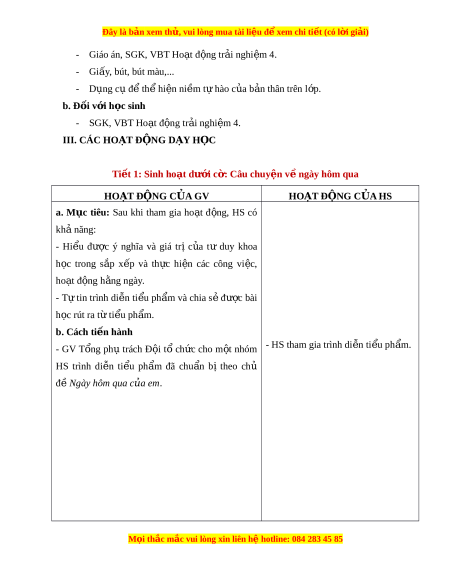 ệ đ xe ể m chi ti t (c ế ó lời gi i ả ) - Giáo án, SGK, VBT Ho t ạ đ n ộ g tr i ả nghi m ệ 4. - Gi y ấ , bút, bút màu,... - D n ụ g c ụ đ ể th ể hi n ệ ni m ề t ự hào c a ủ b n ả thân trên l p ớ . b. Đ i ố v i ớ h c ọ sinh - SGK, VBT Ho t ạ đ n ộ g tr i ả nghi m ệ 4. III. CÁC HO T Ạ Đ N Ộ G DẠY H C Ọ Tiết 1: Sinh ho t ạ dư i ớ c : ờ Câu chuy n ệ v ề ngày hôm qua HO T Ạ ĐỘNG C A Ủ GV HO T Ạ ĐỘNG C A Ủ HS a. M c