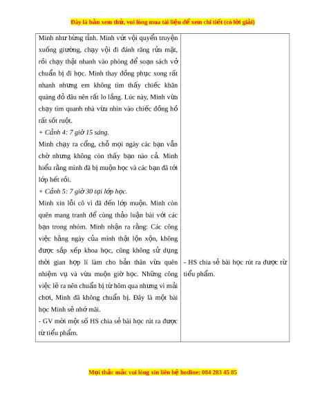 ậ nhanh vào phòng để so n ạ sách vở chu n ẩ bị đi h c. ọ Minh thay đ n ồ g ph c ụ xong r t ấ nhanh nh n ư g em không tìm th y ấ chi c ế khăn quàng đỏ đâu nên r t ấ lo l n ắ g. Lúc này, Minh v a ừ ch y ạ tìm quanh nhà v a ừ nhìn vào chi c ế đ n ồ g hồ r t ấ s t ố ru t ộ . + C n ả h 4: 7 gi ờ 15 sáng. Minh ch y ạ ra c n ổ g, chỗ m i ọ ngày các b n ạ v n ẫ chờ nh n ư g không còn th y ấ b n ạ nào c . ả Minh hi u ể r n ằ g mình đã b ịmu n ộ h c ọ và các b n ạ đã t i ớ l p ớ h t ế r i ồ . + C n ả h 5: 7 gi ờ 30 t i ạ l p ớ h c ọ . Minh xin l i ỗ cô vì đã đ n ế l p ớ mu n ộ . Minh còn