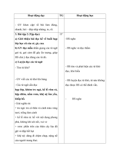 với các vần, tiếng mới. + HS 2 (tổ 2) nói tiếng - Sau đó đổi vai 2 tổ Hoạt động dạy TG Hoạt động học