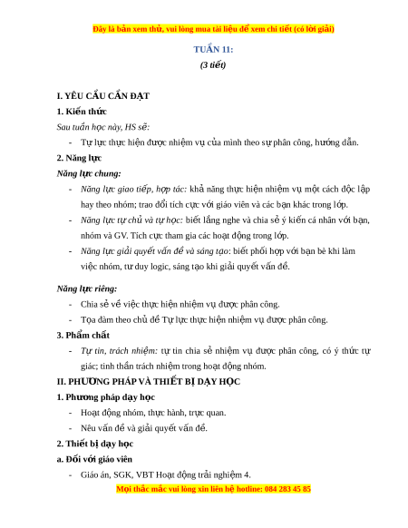 ệ đ xe ể m chi ti t (c ế ó lời gi i ả ) TUẦN 11: (3 ti t ế ) I. YÊU C U Ầ C N Ầ Đ T Ạ 1. Ki n ế th c ứ Sau tu n ầ h c ọ này, HS s : ẽ - T ự l c ự th c ự hi n ệ đ c ượ nhi m ệ v ụ c a ủ mình theo s ự phân công, h n ướ g d n ẫ . 2. Năng l c ự Năng l c ự chung: - Năng l c ự giao ti p ế , h p