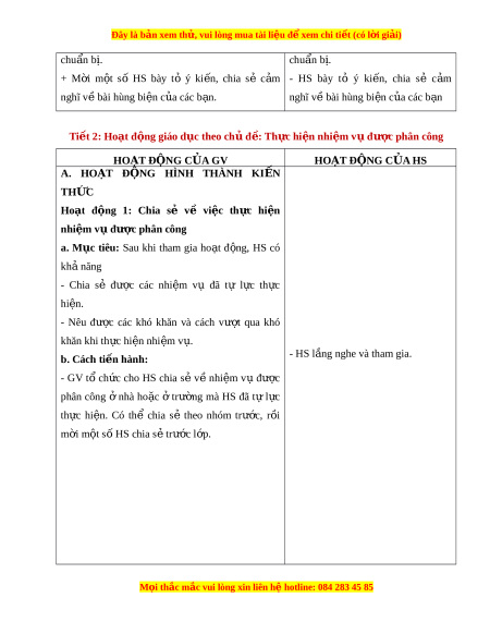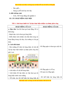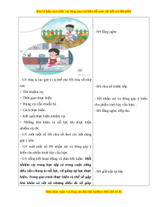 ệ đ xe ể m chi ti t (c ế ó lời gi i ả ) chu n ẩ b .ị chuẩn b . ị + M i ờ m t ộ số HS bày tỏ ý ki n ế , chia sẻ c m ả - HS bày tỏ ý ki n ế , chia sẻ c m ả nghĩ v ề bài hùng bi n ệ c a ủ các b n ạ . nghĩ v ề bài hùng bi n ệ c a ủ các b n ạ Tiết 2: Ho t ạ đ ng ộ giáo d c ụ theo ch ủ đ : ề Th c ự hi n ệ nhi m ệ v ụ đư c ợ phân công HO T Ạ ĐỘNG C A Ủ GV HO T Ạ ĐỘNG C A Ủ HS A. HO T Ạ Đ N Ộ G HÌNH THÀNH KI N Ế THỨC Ho t ạ đ ng ộ 1: Chia sẻ về vi c ệ th c ự hi n ệ nhiệm v