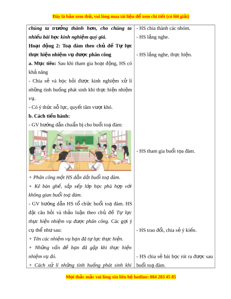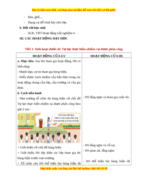 ệ đ xe ể m chi ti t (c ế ó lời gi i ả ) - Bàn, gh , ế ... - D n ụ g c ụ đ ể trình bày trên l p ớ . b. Đ i ố v i ớ h c ọ sinh - SGK, VBT Ho t ạ đ n ộ g tr i ả nghi m ệ 4. III. CÁC HO T Ạ Đ N Ộ G DẠY H C Ọ Tiết 1: Sinh ho t ạ dư i ớ c : ờ T ự l c ự th c ự hi n ệ nhi m ệ v ụ đư c ợ phân công HO T Ạ ĐỘNG C A Ủ GV HO T Ạ ĐỘNG C A Ủ HS a. M c
