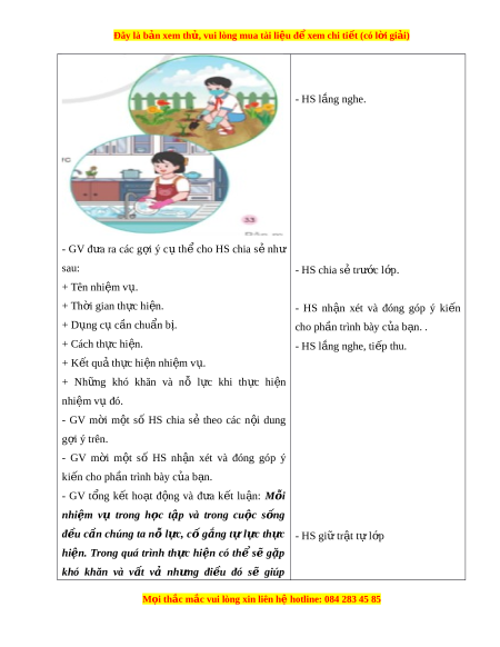 ệ đ xe ể m chi ti t (c ế ó lời gi i ả ) - HS l n ắ g nghe. - GV đ a ư ra các g i ợ ý c ụ th ể cho HS chia s ẻ như sau: - HS chia s ẻ tr c ướ l p ớ . + Tên nhi m ệ v . ụ + Th i ờ gian th c ự hi n ệ . - HS nh n