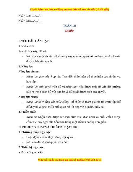 ệ đ xe ể m chi ti t (c ế ó lời gi i ả ) Ngày so n ạ :…/…/… Ngày d y ạ :…/…/… TUẦN 11: (3 ti t ế ) I. YÊU C U Ầ C N Ầ Đ T Ạ 1. Ki n ế th c ứ Sau bài h c ọ này, HS s : ẽ - Nêu đ c ượ m t ộ s ố v n ấ đ ề th n ườ g x y ả ra trong quan h ệ v i ớ b n ạ bè và đ ề xu t ấ đ c ượ cách gi i ả quy t ế . 2. Năng l c ự Năng l c ự chung: - Năng l c ự giao ti p ế , h p ợ tác: Trao đ i ổ , th o ả lu n ậ để th c ự hi n ệ các nhi m ệ vụ h c ọ t p ậ . - Năng l c ự gi i ả quy t ế v n ấ đề và sáng t o ạ : Nêu đ c ượ m t ộ số v n ấ đề th n ườ g x y ả ra trong quan h ệ v i ớ b n ạ bè và đ ề xu t ấ đ c ượ cách gi i ả quy t ế . Năng l c ự riêng: - Năng l c ự thích n ứ g v i ớ cu c ộ s n ố g: Tổ ch c