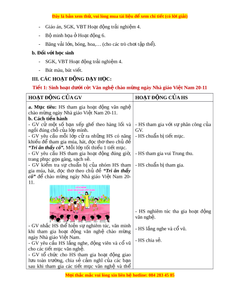 ệ sự nghiêm túc, văn minh - HS l n ắ g nghe và c ổ vũ. khi tham gia ho t ạ đ n ộ g văn nghệ chào m n ừ g ngày Nhà giáo Vi t ệ Nam. - HS chia s . ẻ - GV yêu c u ầ HS l n ắ g nghe, đ n ộ g viên và c ổ vũ cho các ti t ế m c ụ văn ngh . ệ - GV tổ ch c ứ cho HS tham gia ho t ạ đ n ộ g giao l u ư toàn tr n ườ g, chia sẻ c m ả nghĩ c a ủ các b n ạ sau khi tham gia các ti t ế m c ụ văn nghệ và thể M i