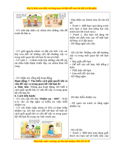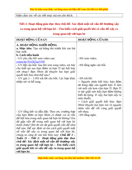 ệ đ xe ể m chi ti t (c ế ó lời gi i ả ) hiện c m ả xúc v ề các ti t ế m c ụ mà em yêu thích. Tiết 2: Ho t ạ đ ng ộ giáo d c ụ theo ch ủ đ : ề Xác đ nh ị m t ộ s ố v n ấ đ ề thư ng ờ x y ả ra trong quan h ệ v i ớ b n ạ bè – Tìm hi u ể cách gi i ả quy t ế khi có v n ấ đ ề x y ả ra trong quan h ệ v i ớ b n ạ bè HOẠT ĐỘNG C A Ủ GV HO T Ạ ĐỘNG C A Ủ HS A. HOẠT ĐỘNG KH I Ở Đ N Ộ G a. M c ụ tiêu: T o ạ sự h n ứ g thú tr c ướ khi vào bài h c ọ m i ớ . b. Cách ti n ế hành - GV yêu c u ầ HS xem video sau: - HS xem video. youtu.be/YtS3E5azVN0 - GV đ t ặ câu h i