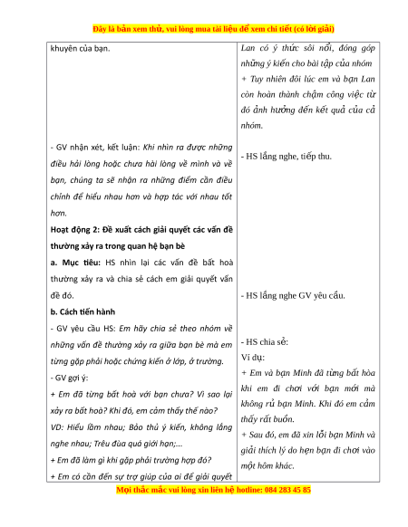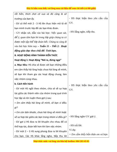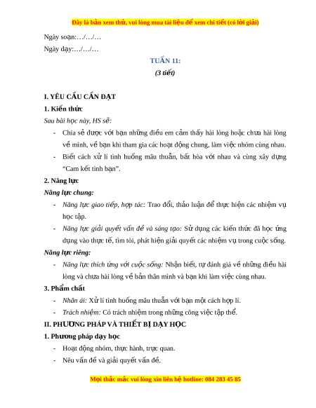 ệ đ xe ể m chi ti t (c ế ó lời gi i ả ) Ngày so n ạ :…/…/… Ngày d y ạ :…/…/… TUẦN 11: (3 ti t ế ) I. YÊU C U Ầ C N Ầ Đ T Ạ 1. Ki n ế th c ứ Sau bài h c ọ này, HS s : ẽ - Chia sẻ đ c ượ v i ớ b n ạ nh n ữ g đi u ề em c m ả th y ấ hài lòng ho c ặ ch a ư hài lòng v ề mình, v ề b n ạ khi tham gia các ho t ạ đ n ộ g chung, làm vi c ệ nhóm cùng nhau. - Bi t ế cách xử lí tình hu n ố g mâu thu n ẫ , b t ấ hòa v i ớ nhau và cùng xây d n ự g “Cam k t ế tình b n ạ ”. 2. Năng l c ự Năng l c ự chung: - Năng l c ự giao ti p ế , h p ợ tác: Trao đ i ổ , th o ả lu n ậ để th c ự hi n ệ các nhi m ệ vụ h c ọ t p ậ . - Năng l c ự gi i ả quy t ế v n ấ đề và sáng t o ạ : Sử d n ụ g các ki n ế th c ứ đã h c ọ n ứ g d n ụ g vào th c ự t , ế tìm tòi, phát hi n ệ gi i ả quy t ế các nhi m ệ v ụ trong cu c ộ s n ố g. Năng l c ự riêng: - Năng l c ự thích n ứ g v i ớ cu c ộ s n ố g: Nh n ậ bi t ế , tự đánh giá v ề nh n ữ g đi u ề hài lòng và ch a ư hài lòng v ề b n ả thân mình và b n ạ khi làm vi c ệ cùng nhau. 3. Phẩm ch t ấ - Nhân ái: X ử lí tình hu n ố g mâu thu n ẫ v i ớ b n ạ m t ộ cách h p ợ lí. - Trách nhi m