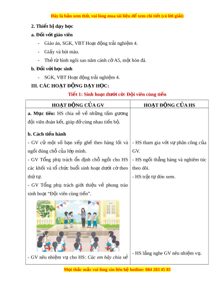 ừ hình ngôi sao năm cánh c ỡ A5, m t ộ hòn đá. b. Đ i ố v i ớ h c ọ sinh - SGK, VBT Ho t ạ đ n ộ g tr i ả nghi m ệ 4. III. CÁC HO T Ạ Đ N Ộ G DẠY H C Ọ : Tiết 1: Sinh ho t ạ dư i ớ c : ờ Đ i ộ viên cùng ti n ế HO T Ạ ĐỘNG C A Ủ GV HO T Ạ ĐỘNG C A Ủ HS a. M c
