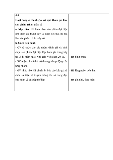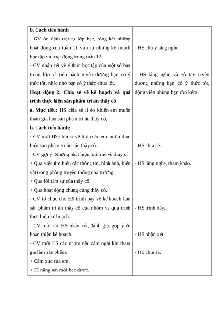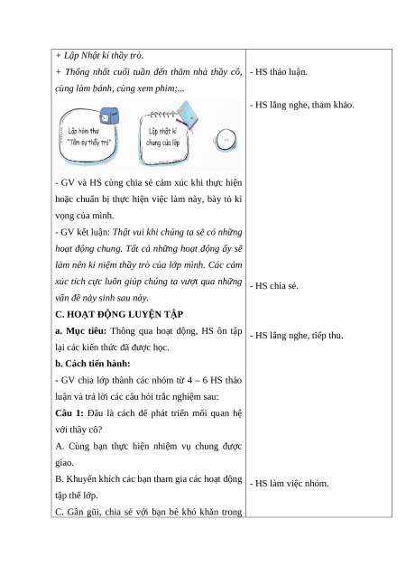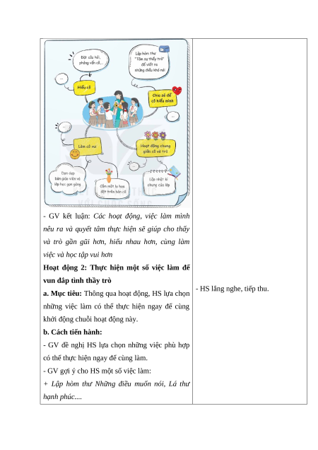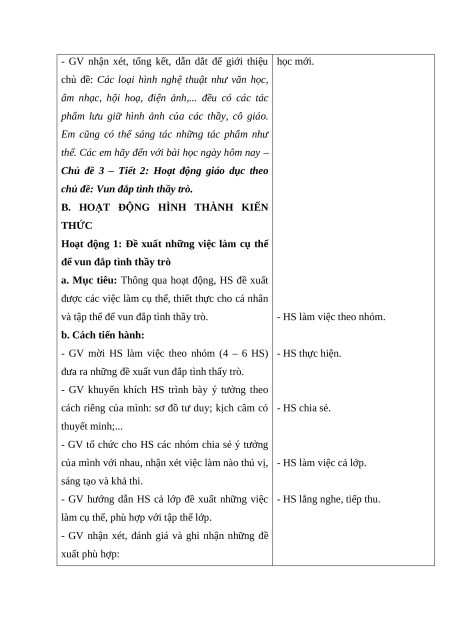 và tập thể để vun đắp tình thầy trò. - HS làm việc theo nhóm. b. Cách tiến hành: