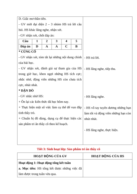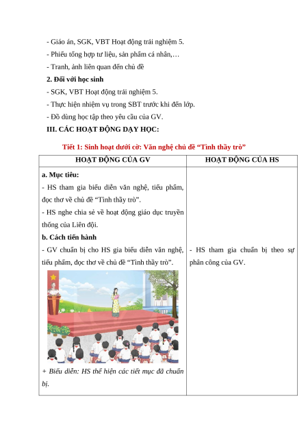 Tiết 1: Sinh hoạt dưới cờ: Văn nghệ chủ đề “Tình thầy trò” HOẠT ĐỘNG CỦA GV HOẠT ĐỘNG CỦA HS a. Mục tiêu:
