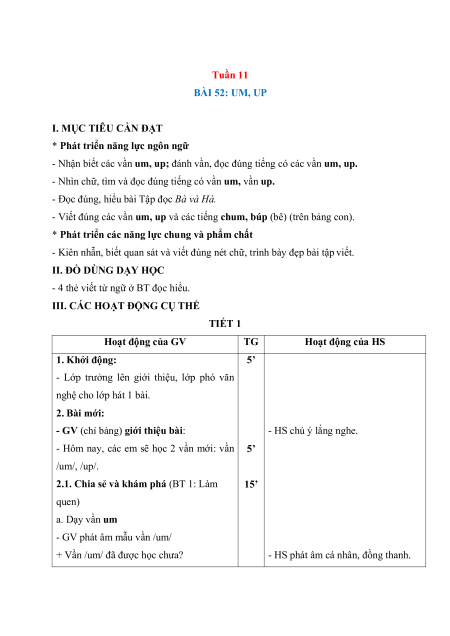 Tuần 11 BÀI 52: UM, UP I. MỤC TIÊU CẦN ĐẠT