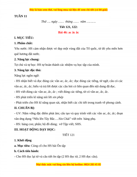 Thứ …. ngày …… tháng …… năm ………. Tiết 121, 122: Bài 46: ac ăc âc I. MỤC TIÊU: 1. Phẩm chất: