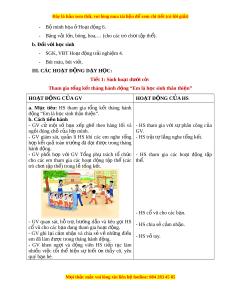 ớ , bóng, hoa,… (cho các trò ch i ơ t p ậ th ). ể b. Đ i ố v i ớ h c ọ sinh - SGK, VBT Ho t ạ đ n ộ g tr i ả nghi m ệ 4. - Bút màu, bút vi t ế . III. CÁC HO T Ạ Đ N Ộ G DẠY H C Ọ : Tiết 1: Sinh ho t ạ dư i ớ c : ờ Tham gia t ng ổ k t ế tháng hành đ n ộ g “Em là h c ọ sinh thân thi n” ệ HOẠT ĐỘNG C A Ủ GV HO T Ạ ĐỘNG C A Ủ HS a. M c