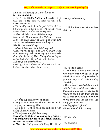 ệ đ xe ể m chi ti t (c ế ó lời gi i ả ) x ử lí tình hu n ố g trong quan h ệ v i ớ b n ạ bè. b. Cách ti n ế hành: - GV yêu c u ầ HS đ c