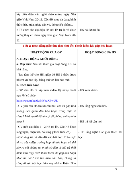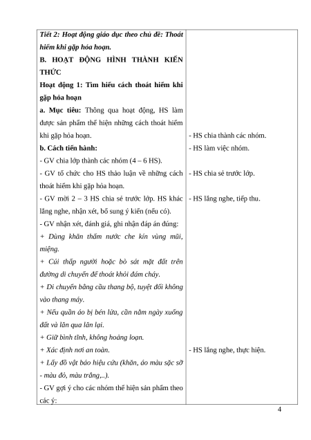 Tiết 2: Hoạt động giáo dục theo chủ đề: Thoát hiểm khi gặp hỏa hoạn HOẠT ĐỘNG CỦA GV HOẠT ĐỘNG CỦA HS