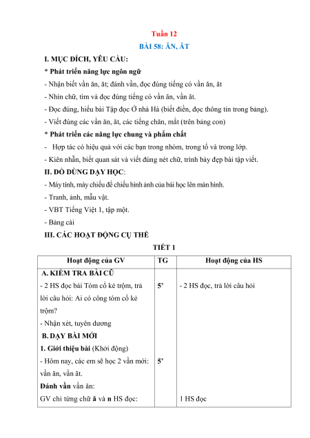 Tuần 12 BÀI 58: ĂN, ĂT I. MỤC ĐÍCH, YÊU CẦU: