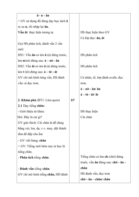 - Hôm nay, các em sẽ học 2 vần mới: 5’ vần ăn, vần ăt. Đánh vần vần ăn: