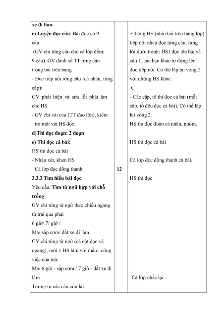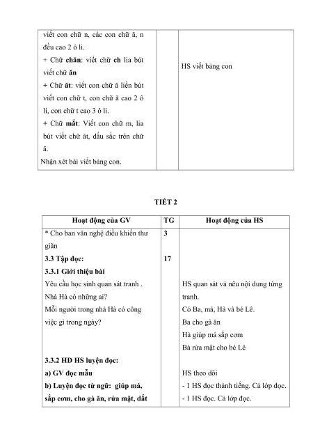 Mỗi người trong nhà Hà có công Có Ba, má, Hà và bé Lê. việc gì trong ngày? Ba cho gà ăn Hà giúp má sắp cơm Bà rửa mặt cho bé Lê 3.3.2 HD HS luyện đọc: a) GV đọc mẫu HS theo dõi