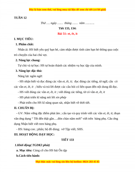 Thứ …. ngày …… tháng …… năm ………. Tiết 133, 134: Bài 51: et, êt, it I. MỤC TIÊU: 1. Phẩm chất: