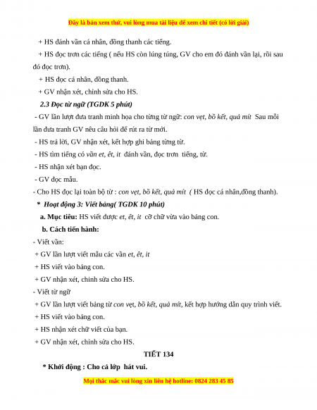a. Mục tiêu: HS đọc được các vần et, êt, it tiếng, từ ngữ có chứa các vần et, êt, it b Cách tiến hành: